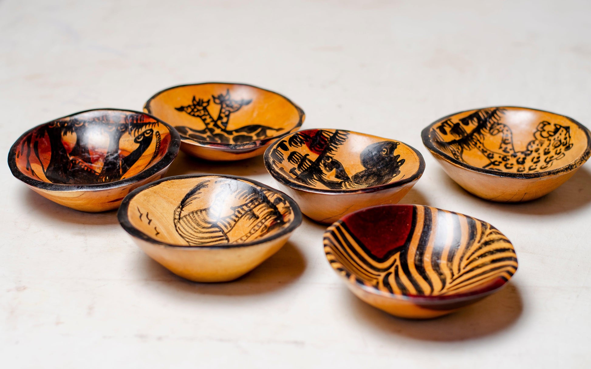 • A set of 6 small round handmade peanut bowls made out of teak wood found in the Western Province of Zambia.